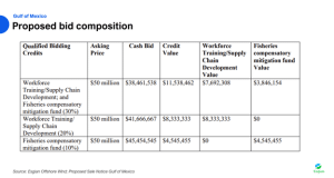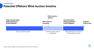 The PSN also offers a peak at the Bureau’s preliminary auction terms. This includes the likely auction format, as well as regionally specific incentive schemes. Within the proposed terms, BOEM suggests a multifactorial approach, as was used in the recent offshore wind auction in California. As in the California auction, bidders would be able to satisfy the asking price in any given round with a bid composed of cash and credits. Credits are cumulative, and together can account for as much as 30% of the cash bid. In the case of the Gulf of Mexico, bidders may be granted credits for commitments in two categories; Workforce Training/Supply Chain Development (up to 20% of cash bid) and contributions to a Fisheries compensatory mitigation fund (up to 10% of cash bid). Notably, the commitments to workforce training and supply chain development apply to the U.S. as a whole and are not state-specific, while the stipulations around contributing to a Fisheries compensatory mitigation fund indicate that funds will be used to “compensate for potential negative impacts to commercial and for-hire recreational fisheries” in the region.