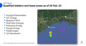 On 24 February the U.S. federal Bureau of Ocean Energy Management (BOEM) posted a Proposed Sale Notice for the Gulf of Mexico in the country’s Federal Register. The Gulf has long been under consideration as a potential wind energy hotspot, with BOEM initially outlining two potential areas for development; Wind Energy Area (WEA) I and WEA M. After soliciting industry feedback, WEA I has now been chiseled down and split into two blocks, OCS-G 37335 and -336, the energy from which will be transported to Galveston, Texas. WEA M (now OCS-G 37334) has only been slightly reduced in size from initial proposals and will connect to Lake Charles, Louisiana. The posting of the PSN is a clear signal to the industry that BOEM is serious; GOM’s first offshore wind auction will happen in 2023, perhaps even within the first half of the year.